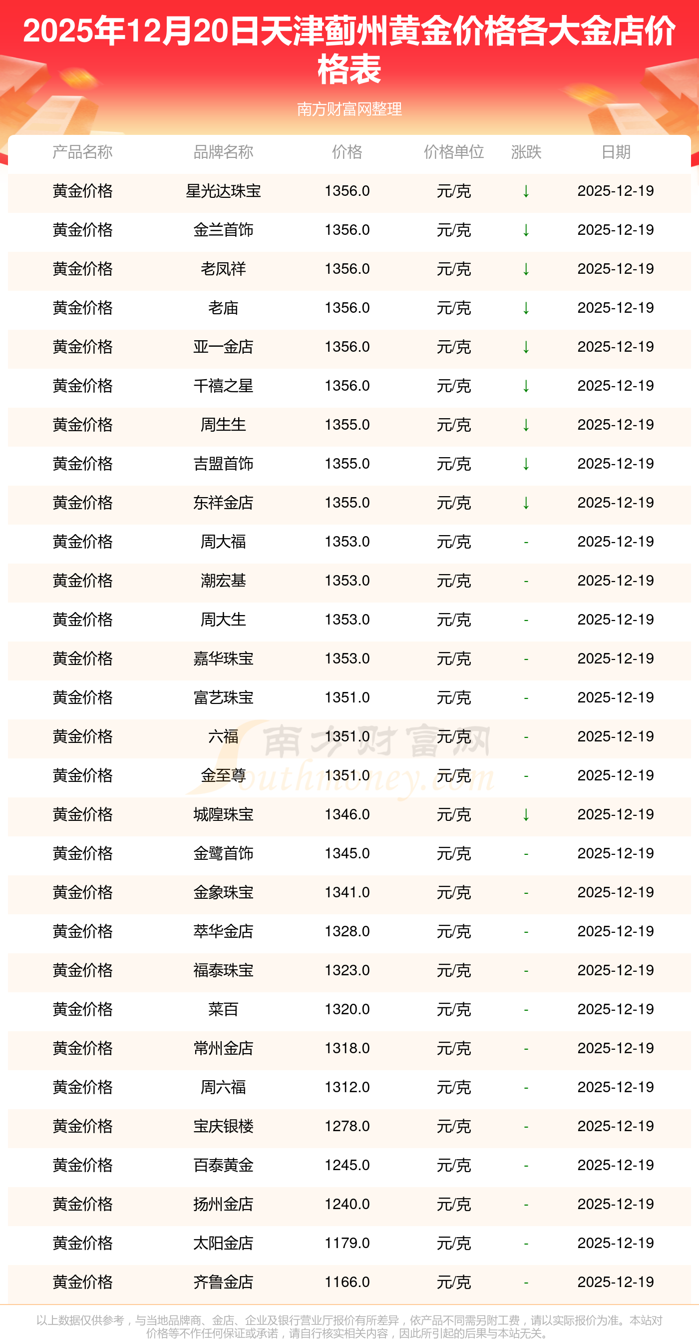 2025年12月20日天津薊州星光達(dá)珠寶、星光達(dá)珠寶、寶泉錢幣、金蘭首飾、金蘭首飾、謝瑞麟、謝瑞麟、謝瑞麟、謝瑞麟、謝瑞麟、金銀街等各大金店品牌黃金價(jià)格最新價(jià)格行情來了,如下:星光達(dá)珠寶黃金價(jià)格1356.0元/克,星光達(dá)珠寶鉑金價(jià)格720.0元/克,寶泉錢幣銀條價(jià)格15.1元/克,金蘭首飾黃金價(jià)格1356.0元/克,金蘭首飾鉑金價(jià)格720.0元/克,謝瑞麟金條價(jià)格(內(nèi)地)1207.0元/克,謝瑞麟金飾價(jià)格(內(nèi)地)1353.0元/克,謝瑞麟黃金飾品(香港)47920.0,謝瑞麟鉑金飾品(香港)16330.0,謝瑞麟金條金價(jià)(香港)43260.0,金銀街投資金條1328.0元/克。