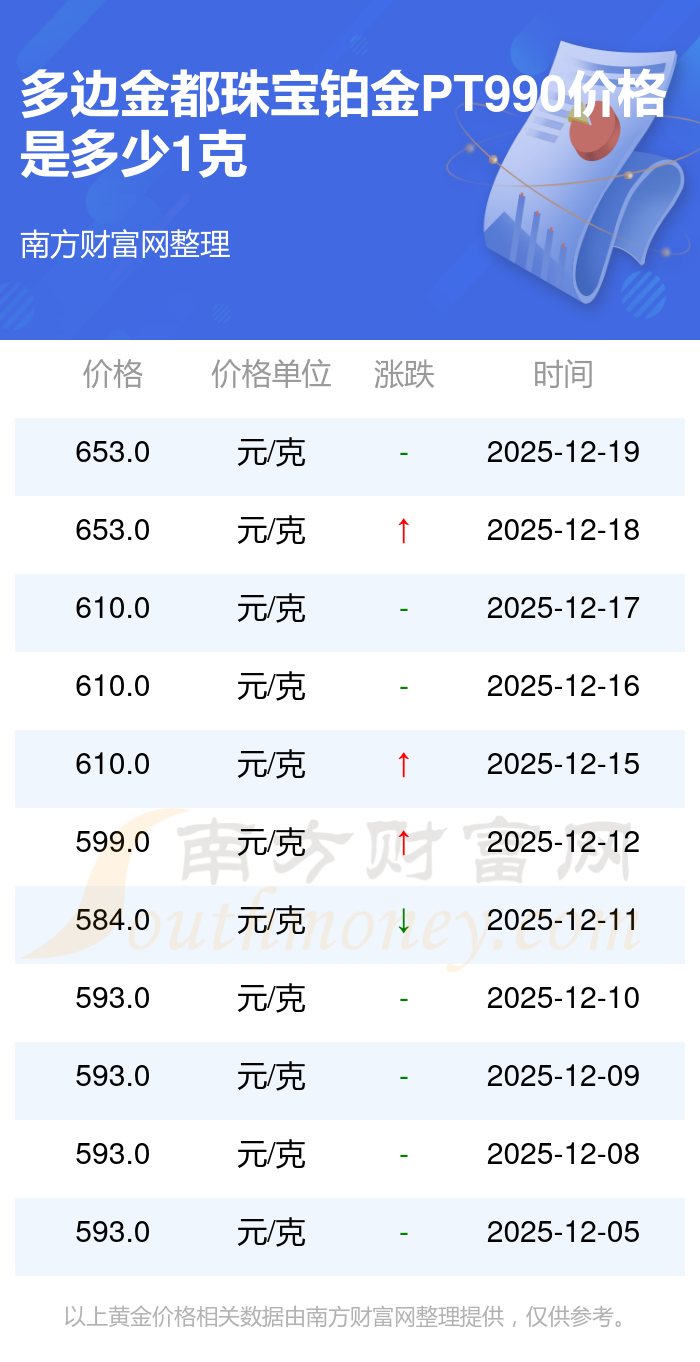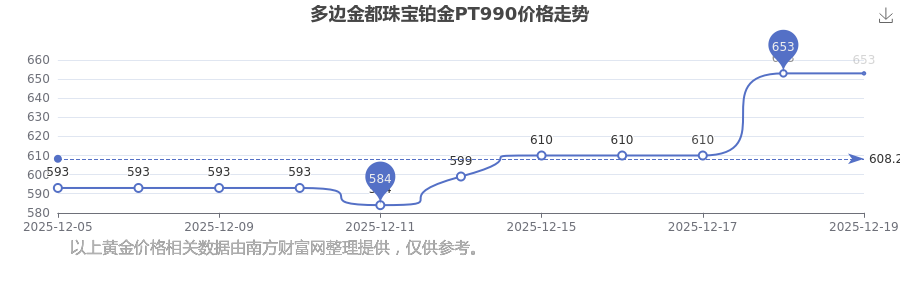 今日多邊金都珠寶鉑金PT990價格為653.0元/克。