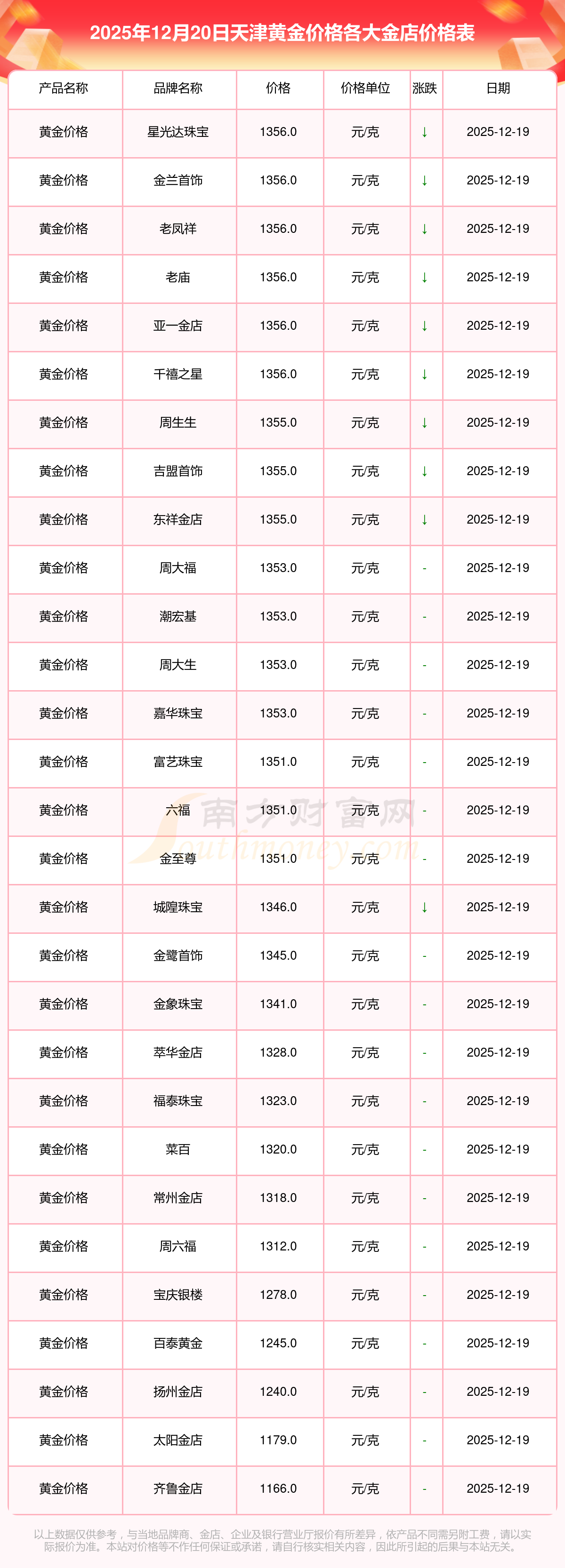 2025年12月20日,天津星光達珠寶、星光達珠寶、寶泉錢幣、金蘭首飾、金蘭首飾、謝瑞麟、謝瑞麟、謝瑞麟、謝瑞麟、謝瑞麟、金銀街等各大金店品牌黃金價格今日價格如下:星光達珠寶1356.0元/克、星光達珠寶720.0元/克、寶泉錢幣15.1元/克、金蘭首飾1356.0元/克、金蘭首飾720.0元/克、謝瑞麟1207.0元/克、謝瑞麟1353.0元/克、謝瑞麟47920.0、謝瑞麟16330.0、謝瑞麟43260.0、金銀街1328.0元/克。