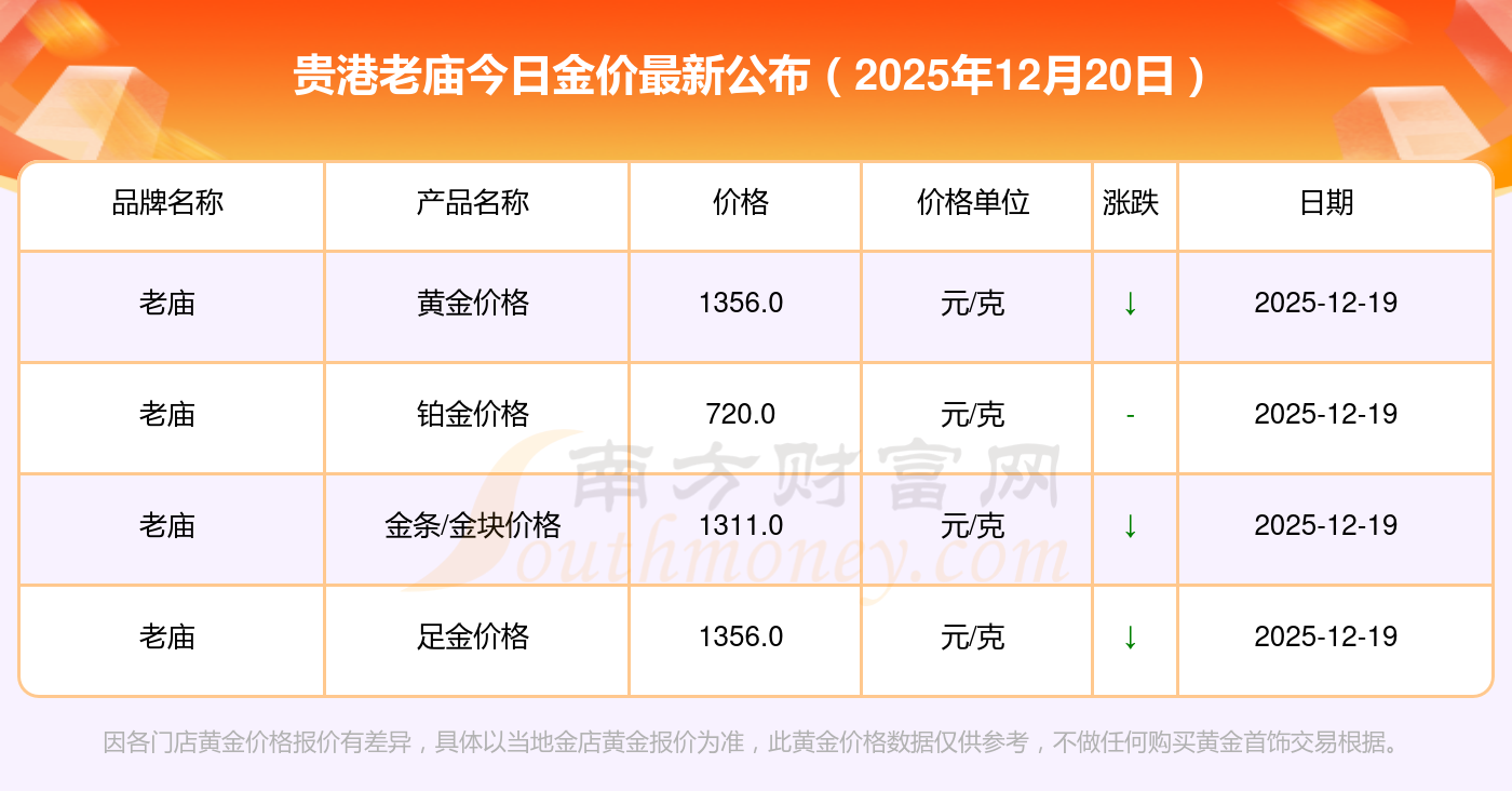 2025年12月20日貴港老廟今日價格:黃金價格1356.0元/克,鉑金價格720.0元/克,銀條價格15.1元/克,黃金價格1356.0元/克,鉑金價格720.0元/克,金條價格(內地)1207.0元/克,金飾價格(內地)1353.0元/克,黃金飾品(香港)47920.0,鉑金飾品(香港)16330.0,金條金價(香港)43260.0,投資金條1328.0元/克。