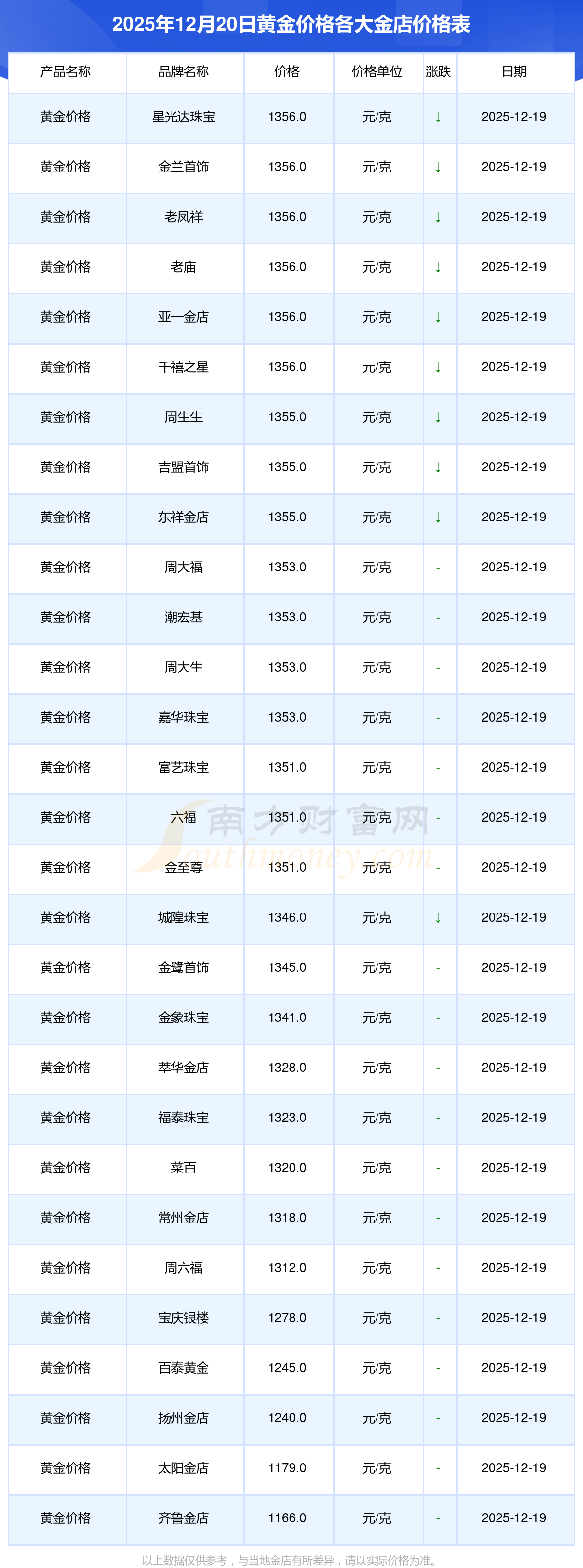 2025年12月20日各大金店黃金價格多少一克?各大金店黃金價格報價一覽表,一起來看看吧!