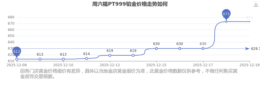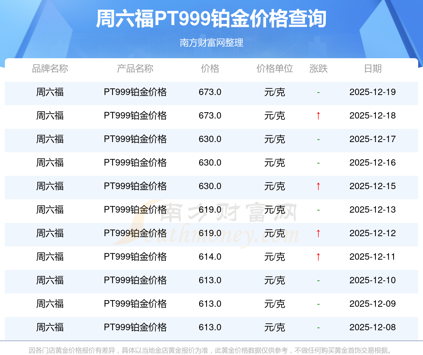 今日周六福 PT999鉑金價格,最新確定為673.0元/克。