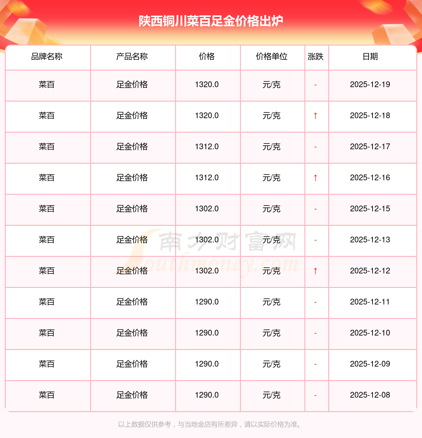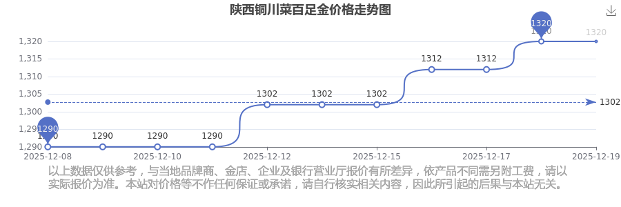 今日(2025年12月20日)陜西銅川菜百足金價格:1320.0元/克。