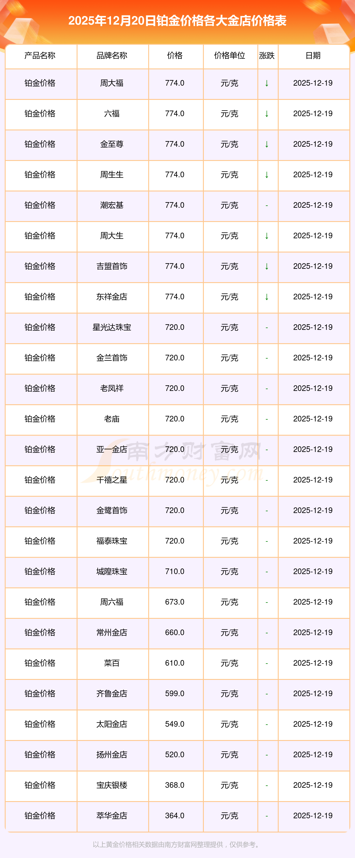 2025年12月20日各大金店鉑金價格最新價格:星光達珠寶1356.0元/克,星光達珠寶720.0元/克,寶泉錢幣15.1元/克,金蘭首飾1356.0元/克,金蘭首飾720.0元/克,謝瑞麟1207.0元/克,謝瑞麟1353.0元/克,謝瑞麟47920.0,謝瑞麟16330.0,謝瑞麟43260.0,金銀街1328.0元/克。