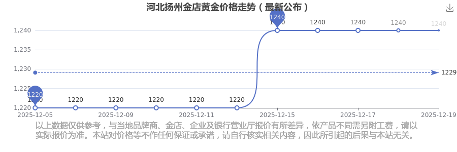 2025年12月20日,河北揚州金店黃金價格每克的售賣價位為1240.0元/克。