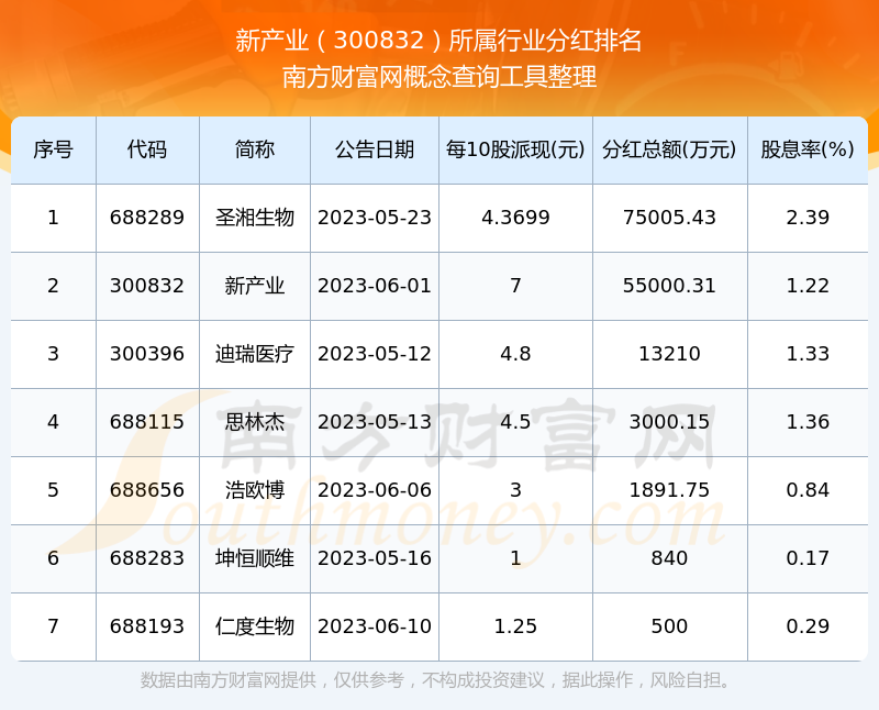 按照南方財富網趨勢選股系統統計,新產業所屬行業為試劑行業,試劑行業分紅排名情況如下表: