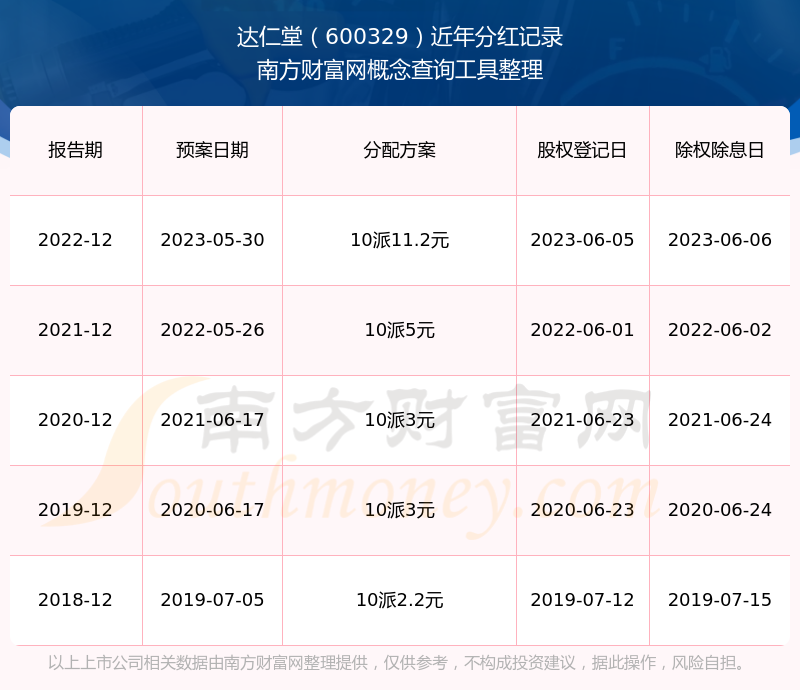 達(dá)仁堂最新一次公布的分紅方案為10派11.2元。本次權(quán)益分派股權(quán)登記日為2023年6月5日,除權(quán)除息日為2023年6月6日,派息日為2023年6月6日。