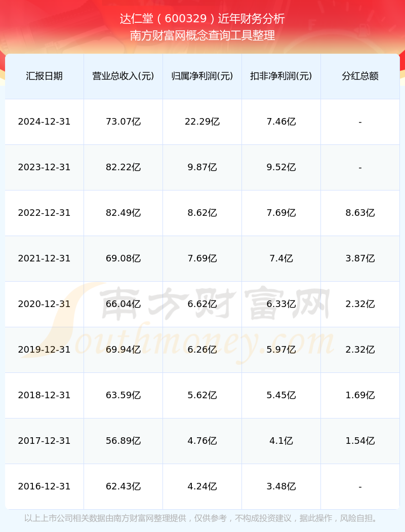 2024年達(dá)仁堂總營收73.07億,同比增長-11.14%;凈利潤22.29億,同比增長125.94%;銷售毛利率48.18%。