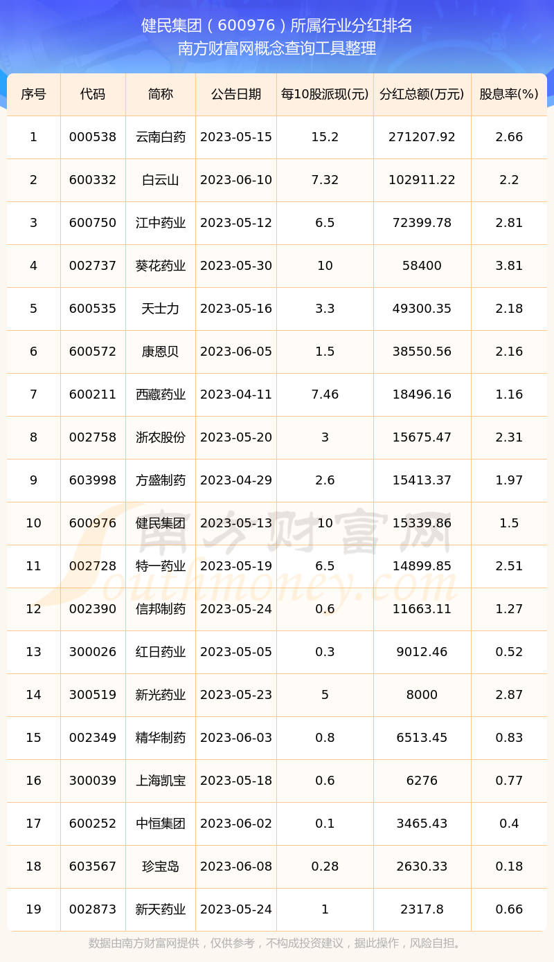 按照南方財富網趨勢選股系統統計,健民集團所屬行業為中藥行業,中藥行業分紅排名情況如下表: